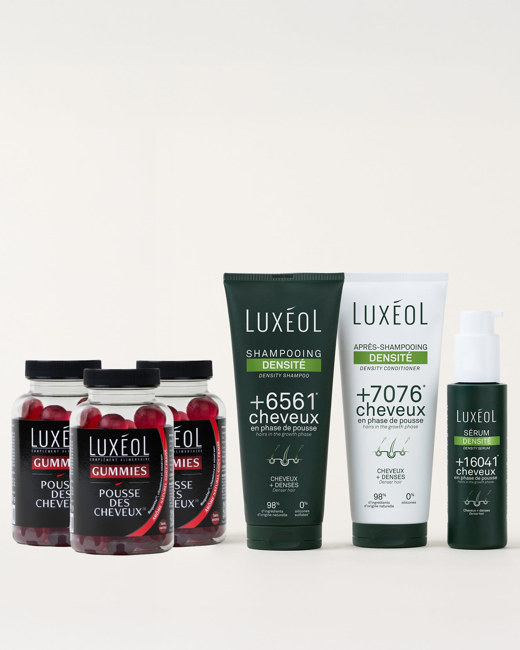 Les soins Densité (shampooing, après-shampooing et sérum) complètent cette action en augmentant la densité capillaire et en fortifiant la fibre.