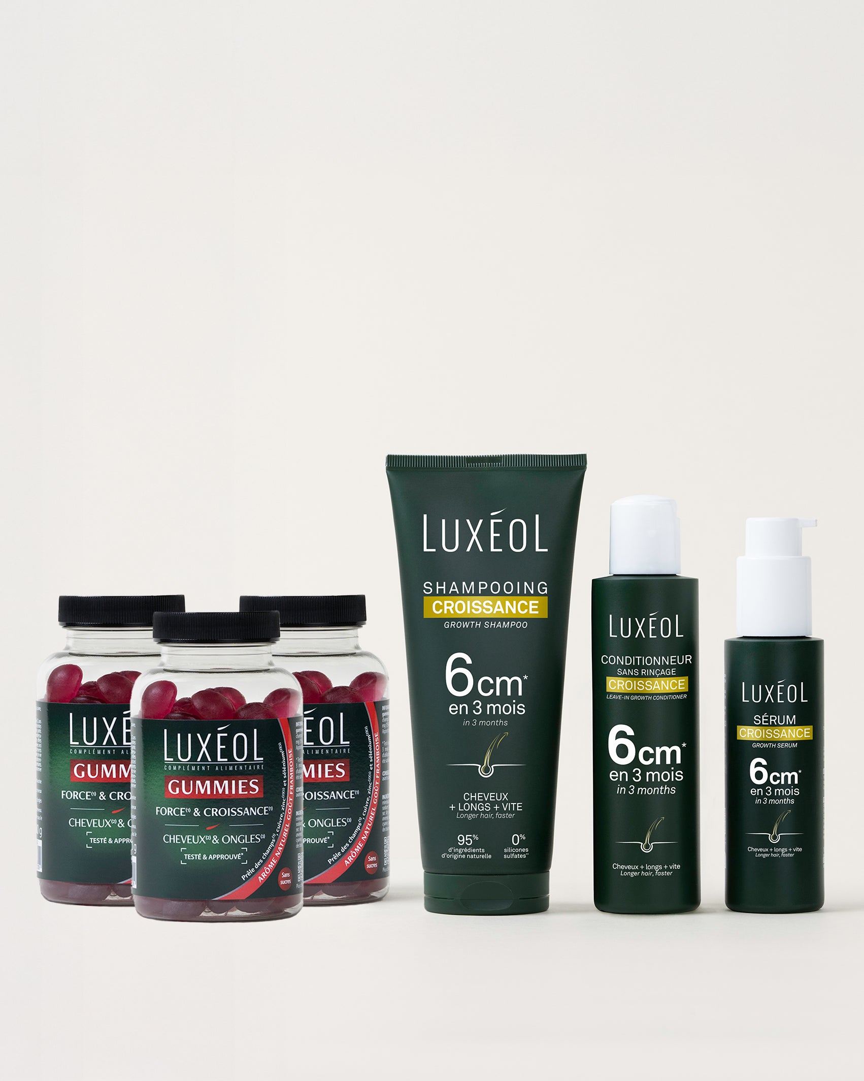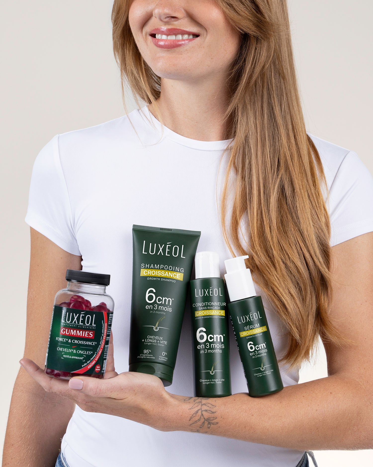 Le Protocole Cosmétique Croissance (shampooing, conditionneur sans rinçage et sérum) agit de l’extérieur pour accélérer la croissance de 6 cm en 3 mois*. Enrichi en huile de ricin, biotine, extrait de racine de ginseng et panthénol, il nourrit, fortifie et répare la fibre capillaire pour des cheveux éclatants de santé.
