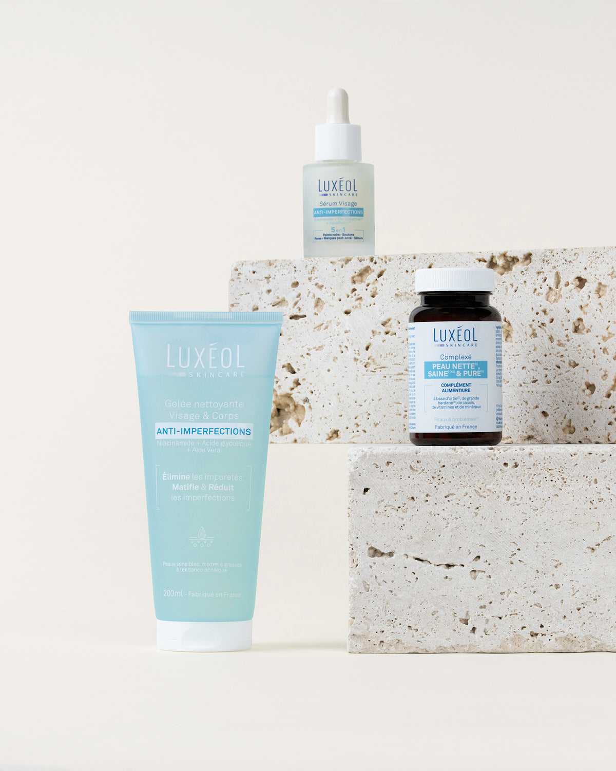 Clínicamente probado: puntos negros -44 %, granos -43 %, poros -43 %, sebo -20 %, marcas post-acné -39 %*.